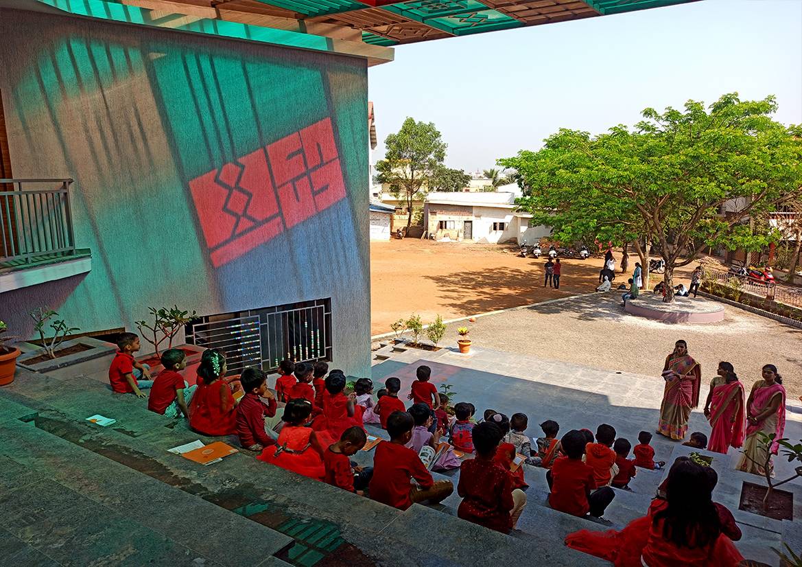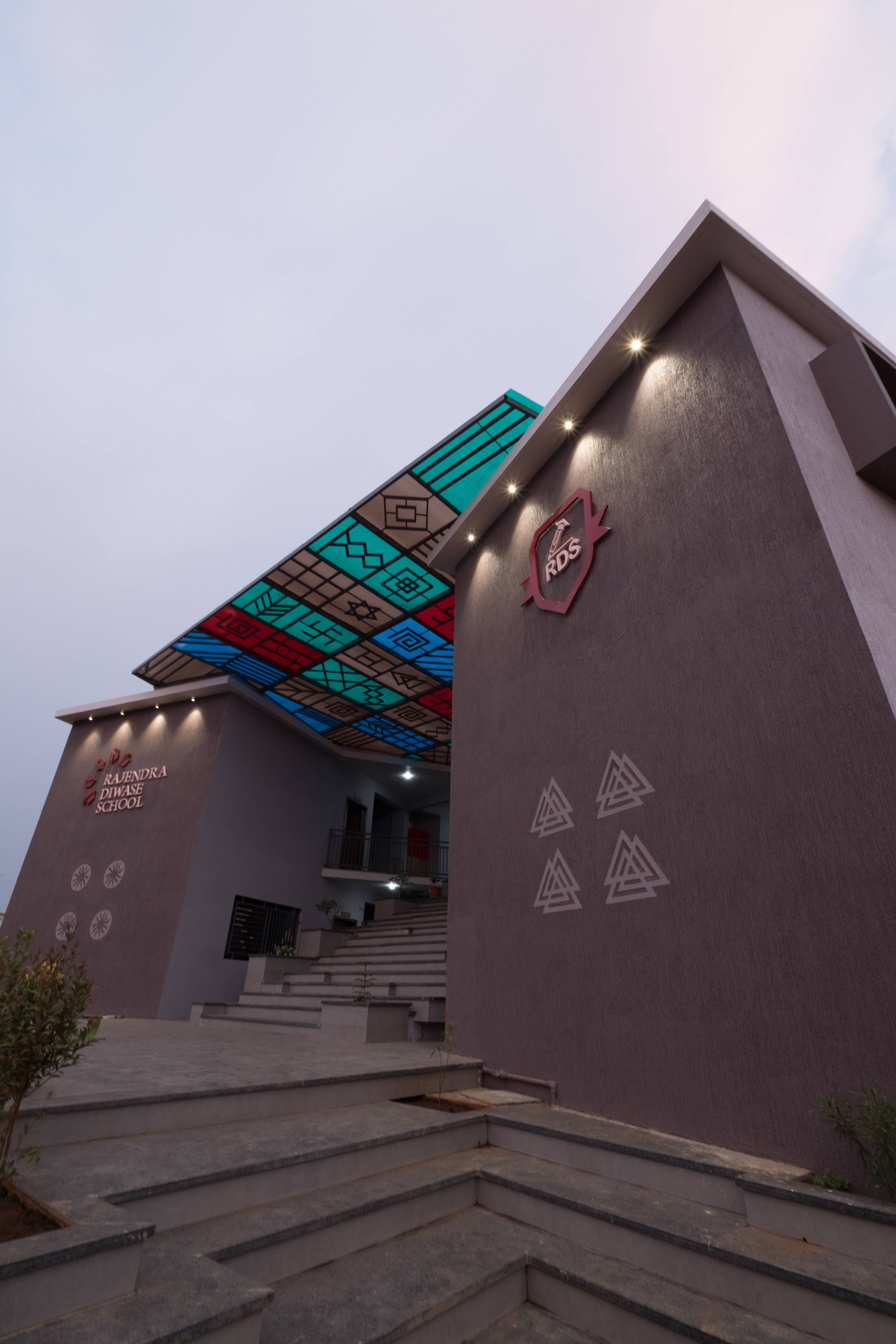 The design aimed to provide quality space and respond to site conditions. Planning evolved around an existing tree, which witnessed the building's journey from start to finish and will continue to witness the journeys of many students. The tree offers comfortable shade for outdoor teaching, embracing the traditional gurukul method. Children play around it, climb its branches, and share tiffin under its shade. Two major axes were generated, forming the built mass, with a flight of steps in the void between, giving character to the building. These steps act as a courtyard, amphitheatre, covered assembly area, and a place for interaction.